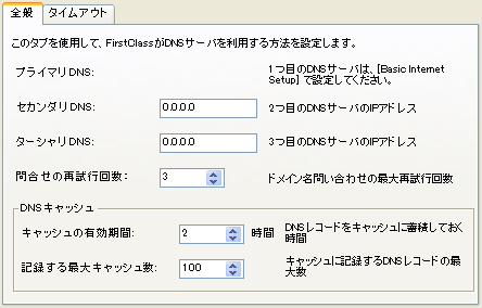 このタブを使用して、FirstClassがDNSサーバからの応答を待機する時間を指定します。