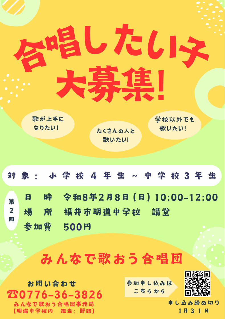 <お知らせ小4~中3>合唱したい子大募集 2/8【申込締切1/31】