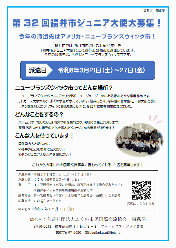 <お知らせ 中学校>第32回福井市ジュニア大使募集