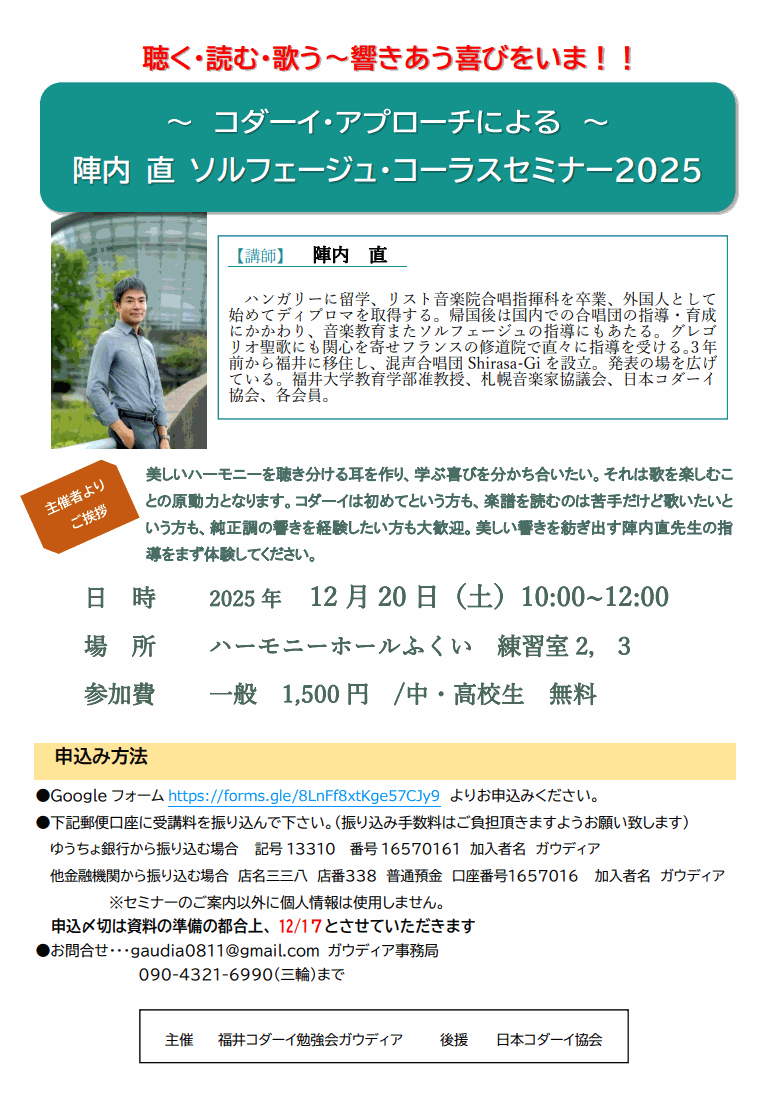 <お知らせ>陣内直ソルフェージュ・コーラスセミナー2025【12/20】】
