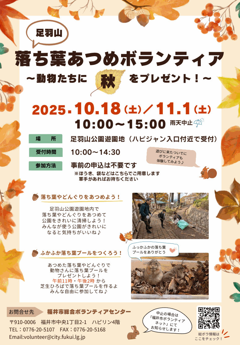 <お知らせ>足羽山落ち葉集めボランティア~動物たちに秋をプレゼント~ 10.18 11.1