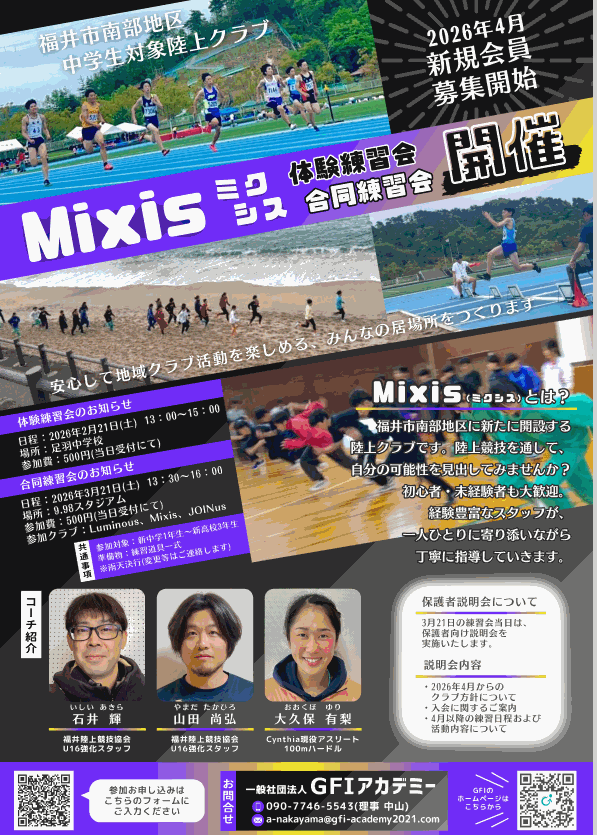 <お知らせ 中学校>陸上クラブMixis(福井市南部)練習会