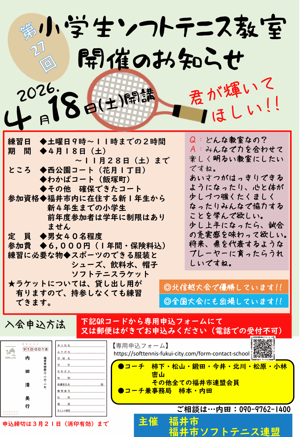 <お知らせ小学生>第27回小学生ソフトテニス教室