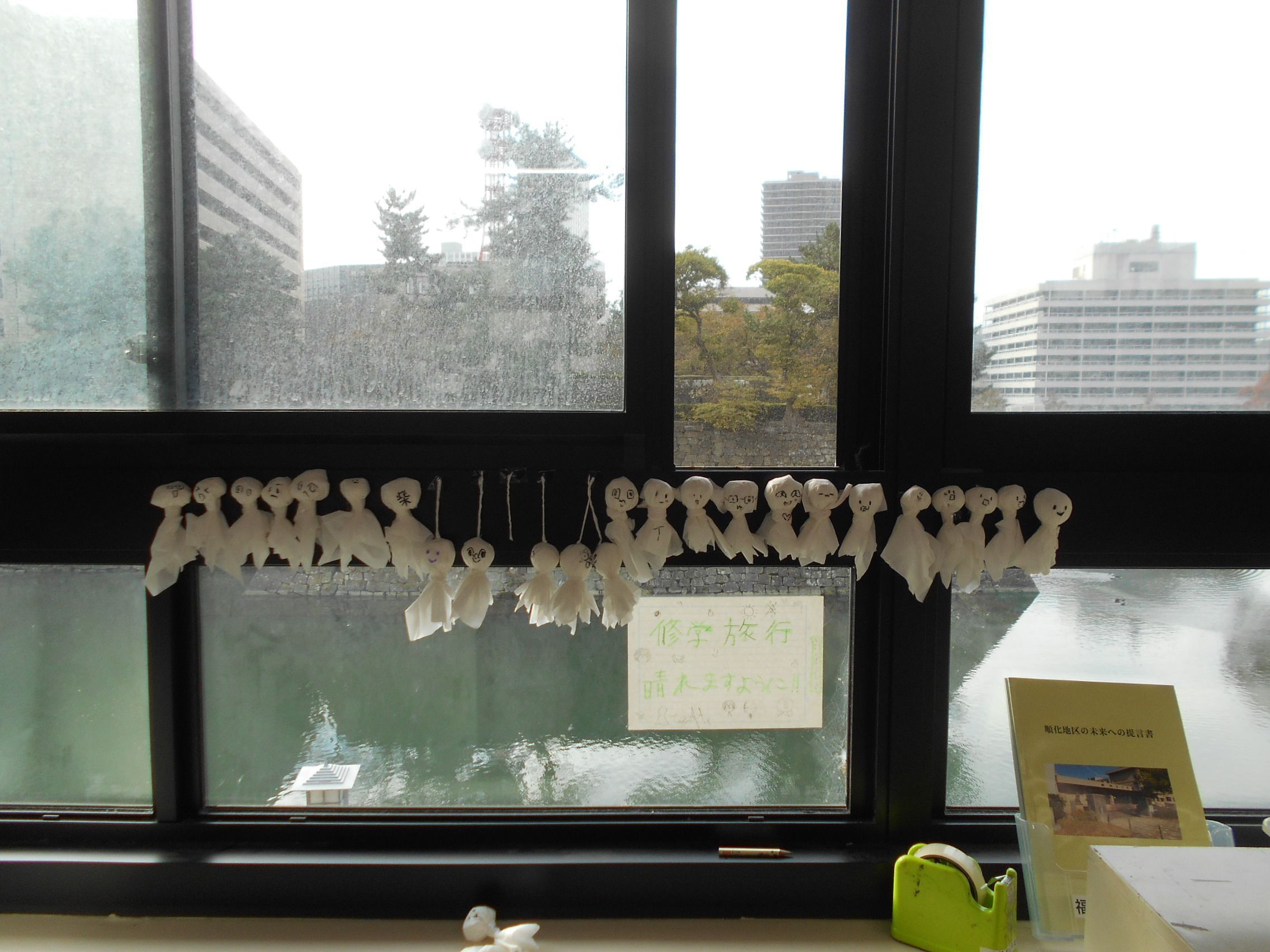 教室の子どもたちの作った、てるてる坊主がにこにこしていました。