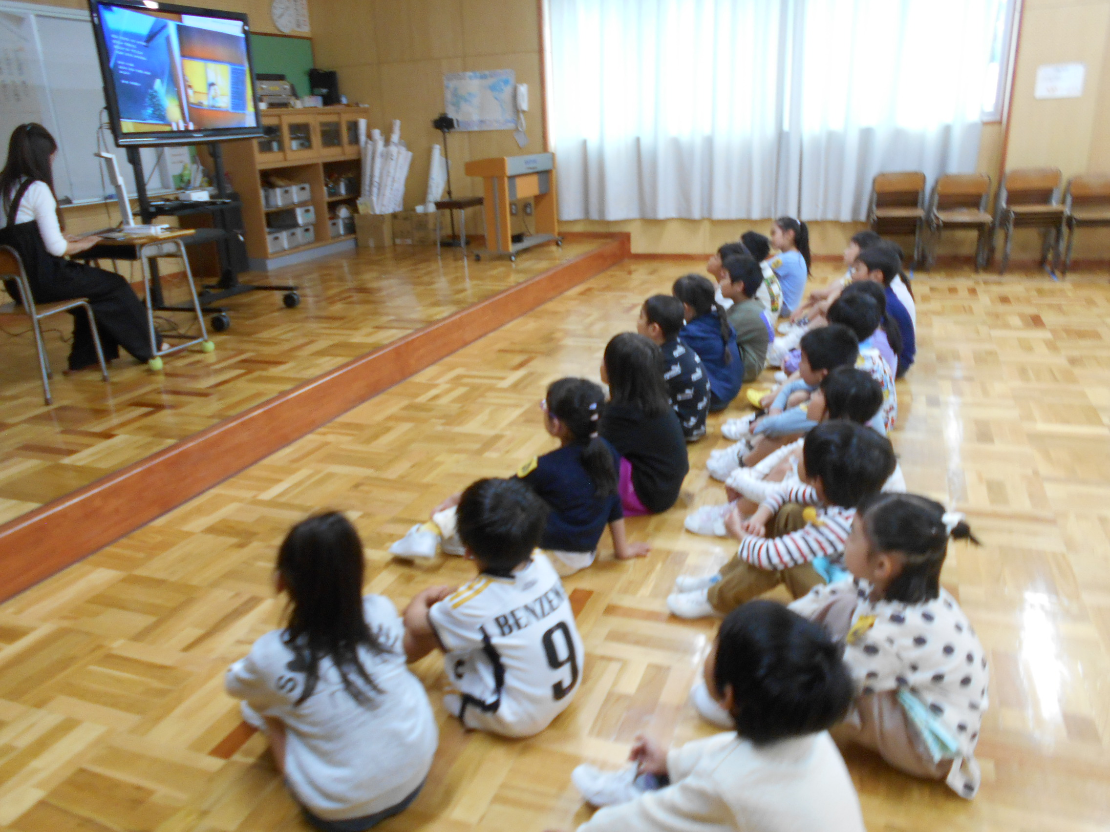 今日の朝活動で、保護者による「読み聞かせ」がありました。