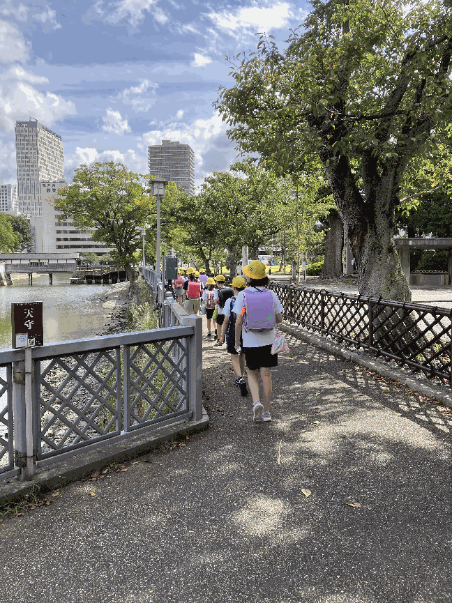 子どもたちは、暑い中、集団下校で元気に帰っていきました。