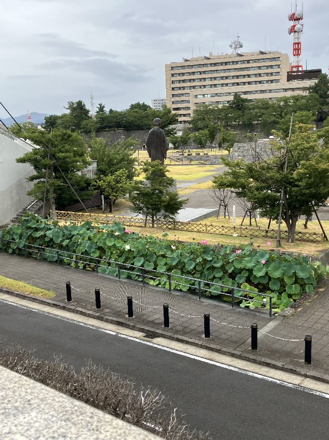 岡倉天心像の足下には、はすの花が美しく咲いています。