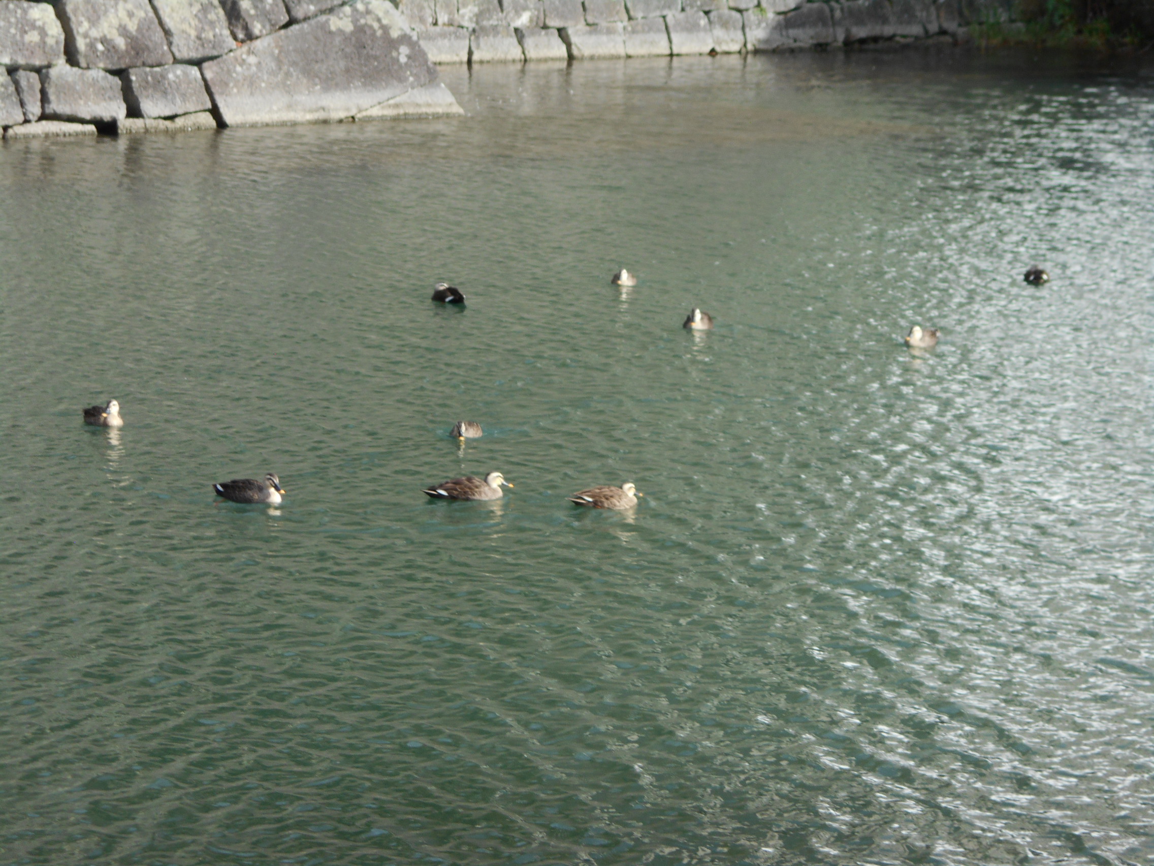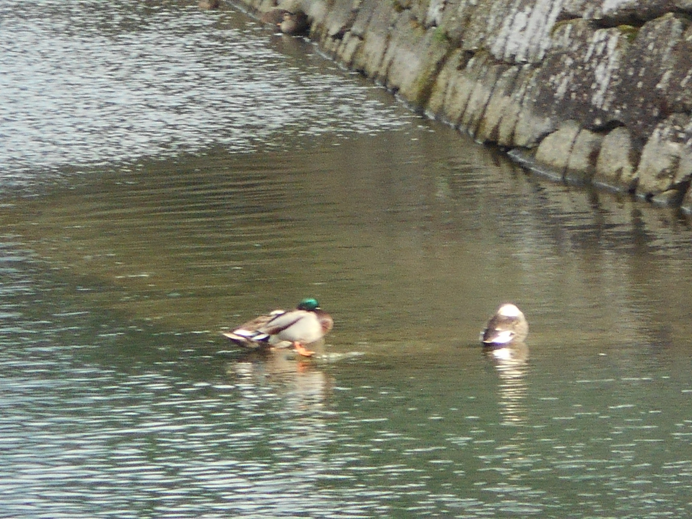 ぽかぽか、ひなたぼっこをしているカモの親子や、
