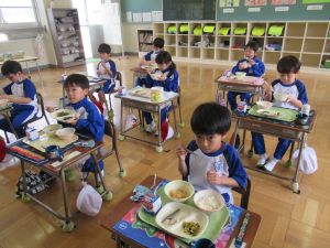 1年生が小学校で初めて給食を食べました。