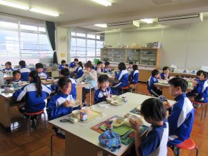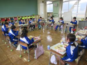 で一緒に給食準備をし、食べました。