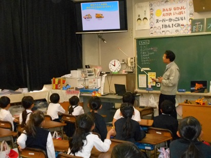 1年生が、ゲストティーチャーをお招きして、「働く車」について学習していました。