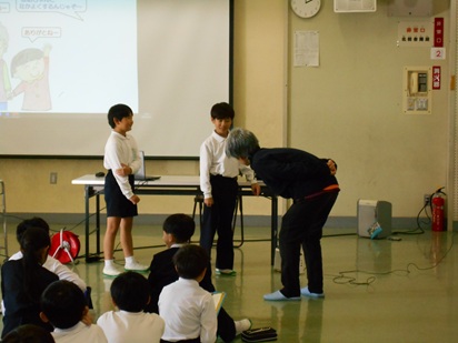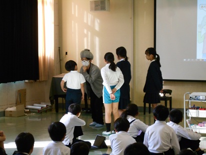 子どもたちは、お年寄りの擬似体験をしたり、認知症についての寸劇を鑑賞したりして、
