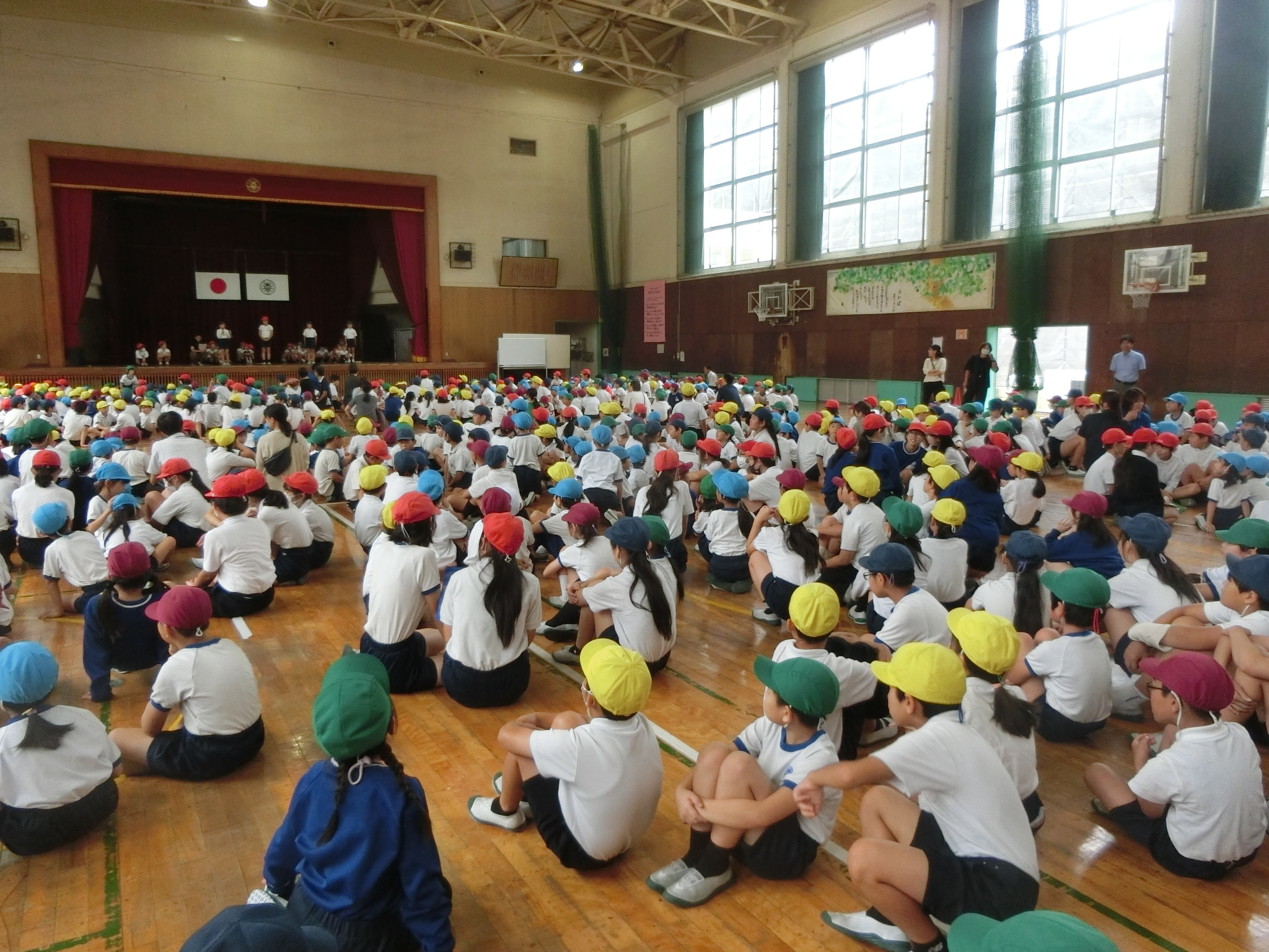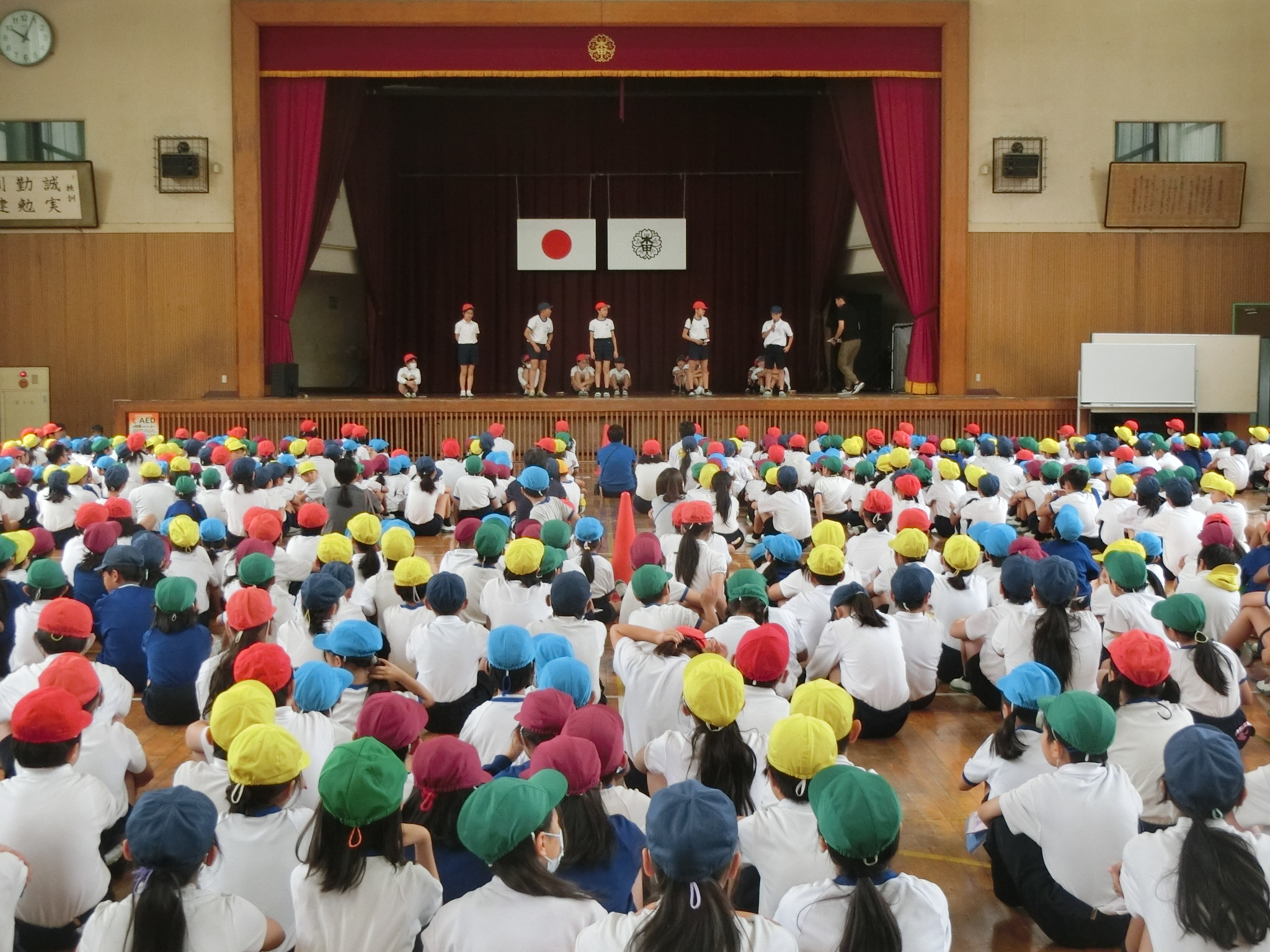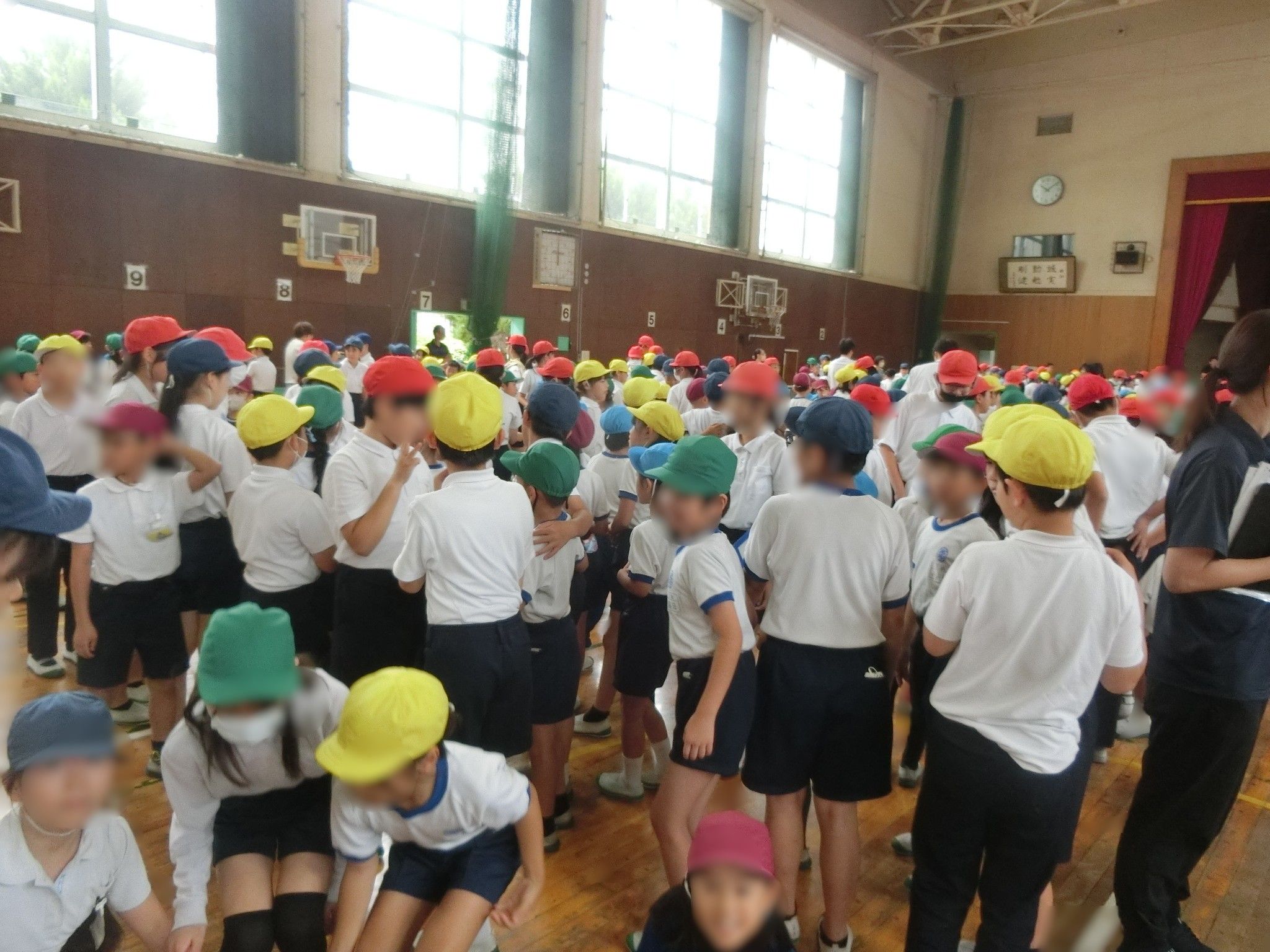 体育館に全校児童が集まり、運営委員会が司会・進行をしながら「みんなで集まろうゲーム」をしました。