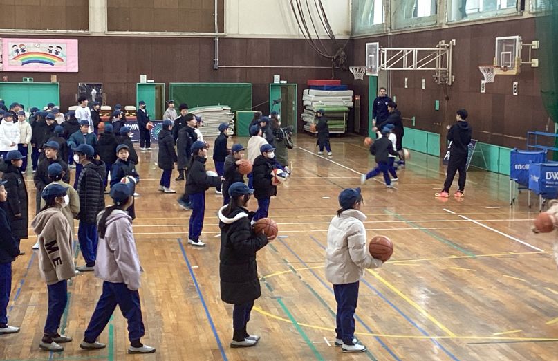 二人の選手からバスケットボールのシュートやドリブルの仕方を教えてもらい、選手に見てもらいながら練習しました。