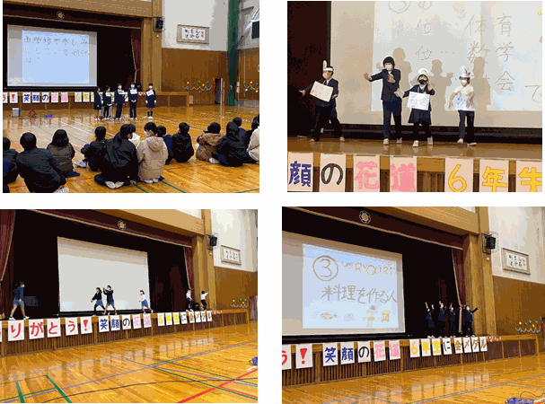 2月24日、25日に「6年生を送る会」がありました。5年生は25日の「6年生クイズ」を担当しました。「6年生クイズ」は、感染予防のためにゲームでのふれあいができなくなったことを受けて、6年生に楽しんでもらうために考え出したものです。6年生に笑顔になってもらおうということで、一生懸命工夫をして臨みました。