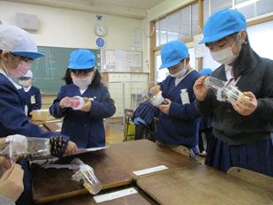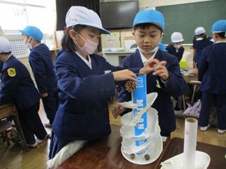 | 生活科の学習で、冬の北風を生かして風車あそびをしました。紙コップと爪楊枝、曲がるストローを使った風車ができると、「こんな簡単にできて、本当に回るの。」と不思議そうにし |
