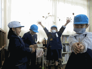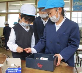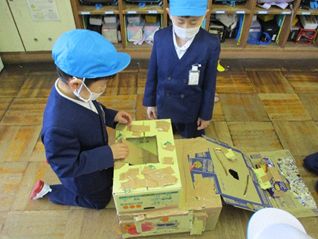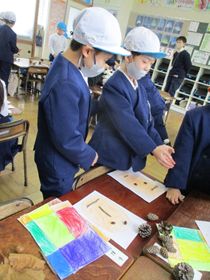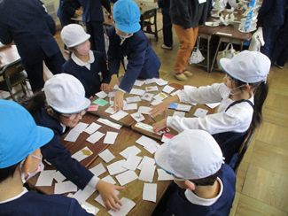 11月から秋のおもちゃ作りを始め、今日、作ったおもちゃでお店を開いて学年で交流しました。おもちゃの作り方や遊び方を考えたり準備したりするときから、とても意欲的だった子どもたち。自分のクラスにはないおもちゃにも出あうことができ、目を輝かせながら楽しんでいました。