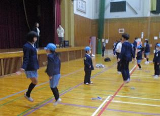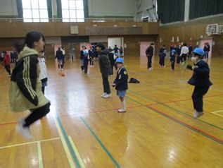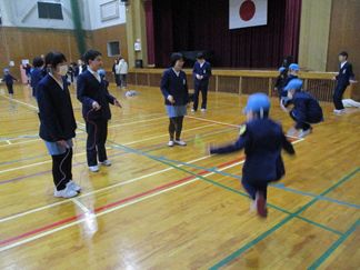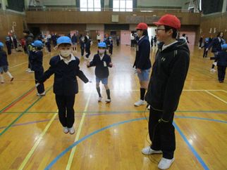 | なかよし班の6年生から、なわとびの技のコツを教えてもらいました。「こうやって跳ぶといいよ。」「足はこのくらい上げると上手くできるよ。」など、たくさんアドバイスをもら |
