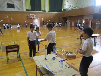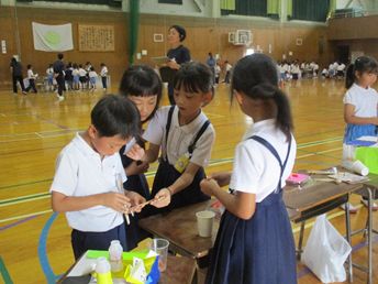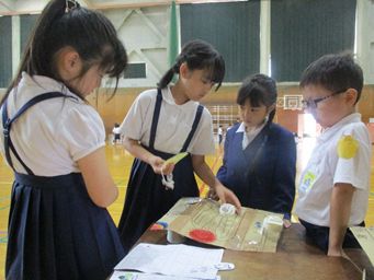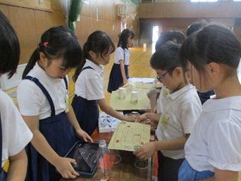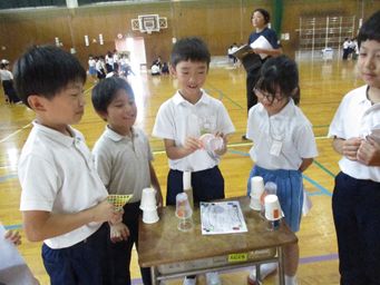 | 図画工作科の色水あそびと、生活科の水を使った的当てを組み合わせて、みずあそびをしました。 色水あそびでは、色を組み合わせてできる色に関心を持ち、友だちと比べたり、友だち |