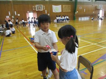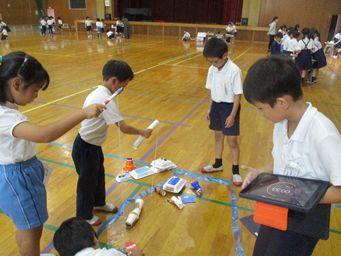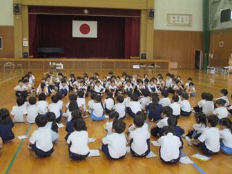 | 夏休み前、最終日。はじめての夏休みに向けての宿題やおたよりを確認しました。3時間目の体育では、「夏をのりきろう会」と題し、体育館で「なんでもバスケット」をしました。「 |