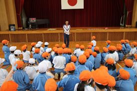 大休みは、なわとびの技を全校児童に披露していただきました。子どもたちは音楽に合わせて次々と繰り出される技に驚いたり、感動したりしていました。また途中には、本校の教員と二人並んでなわを持ち合いながらの交差跳びも見せてくださいました。そして最後には七重跳びを見事成功させて、全校からは大きな拍手が起こりました。