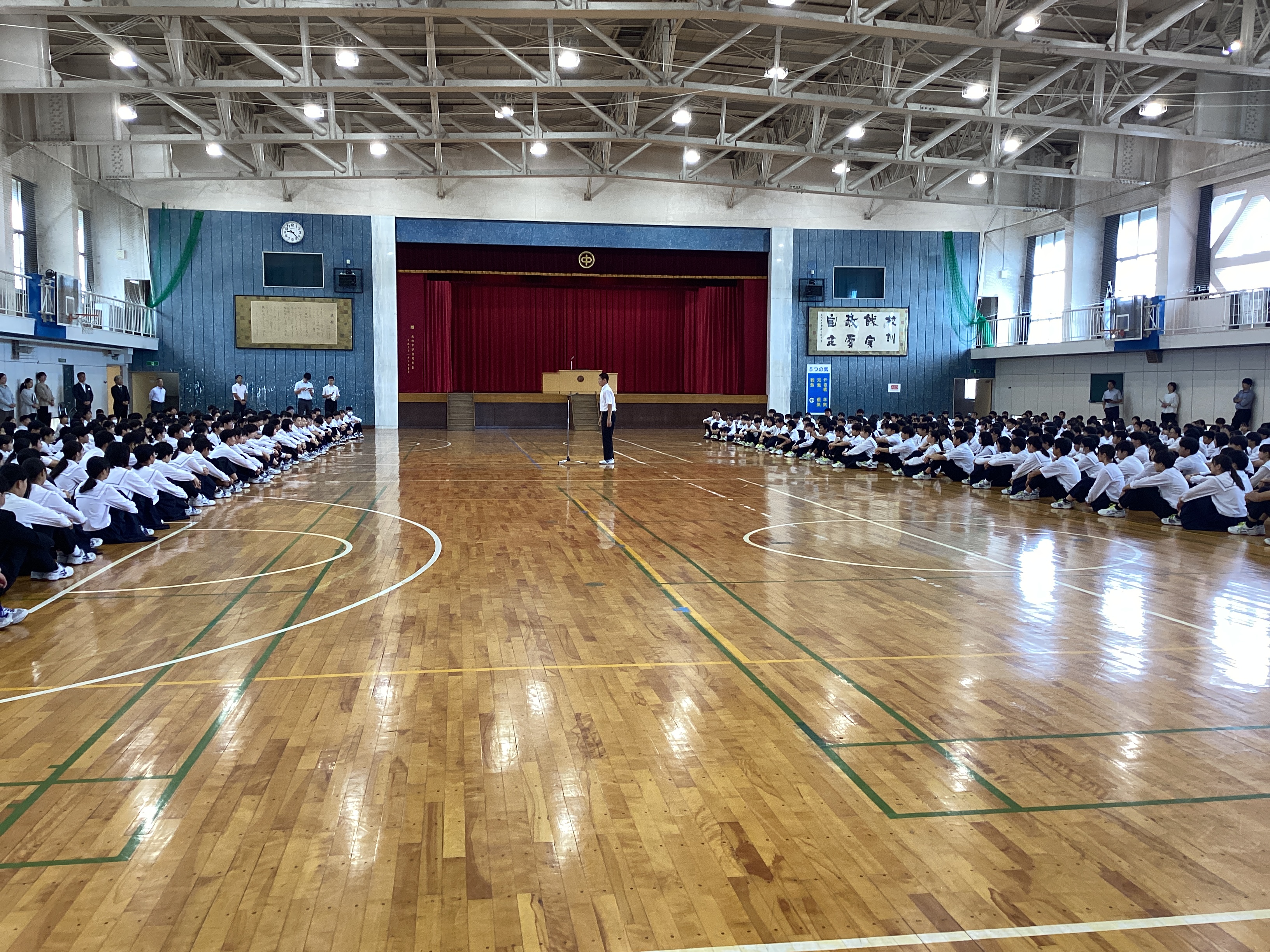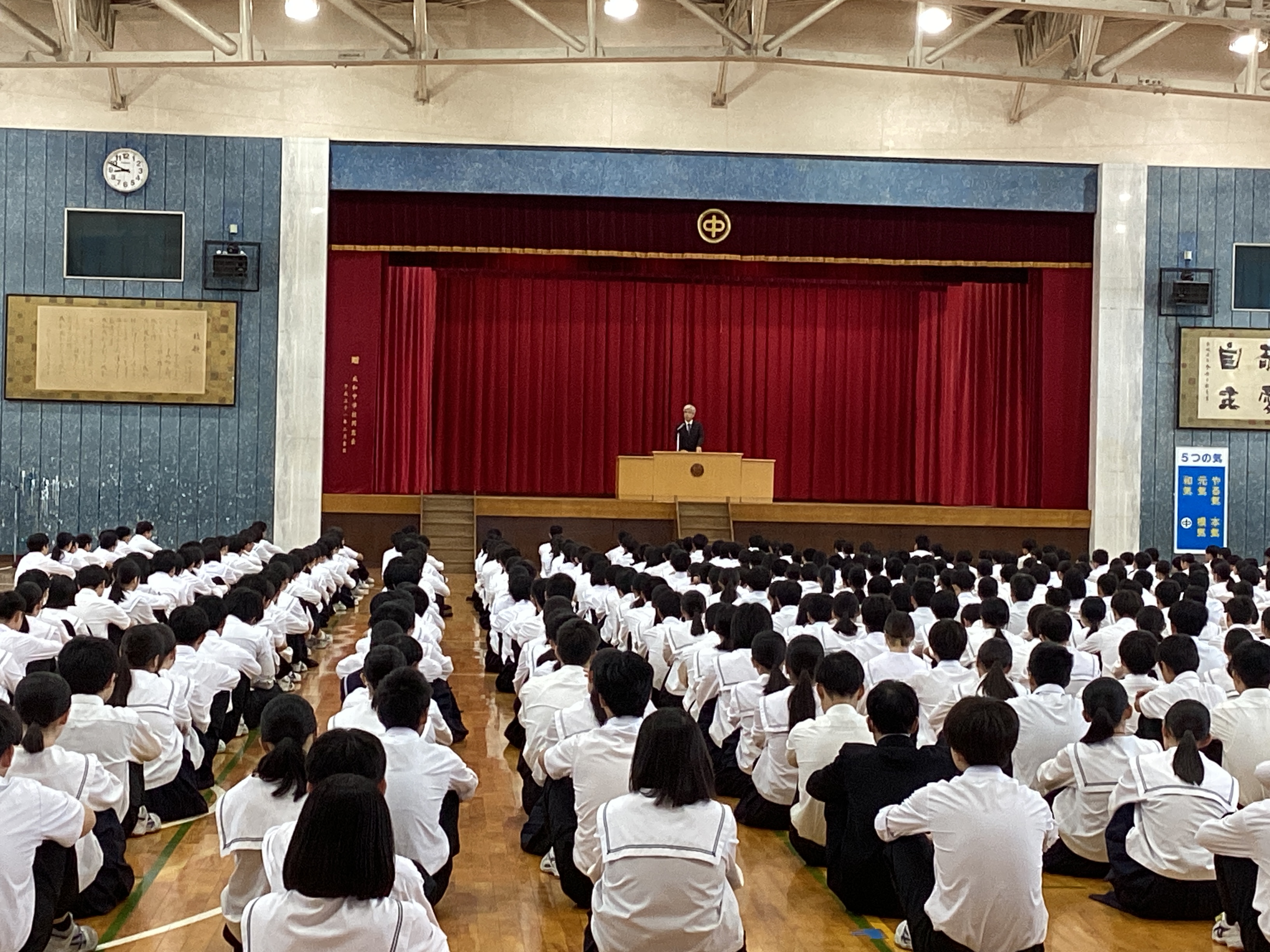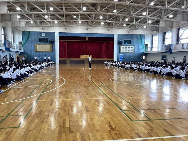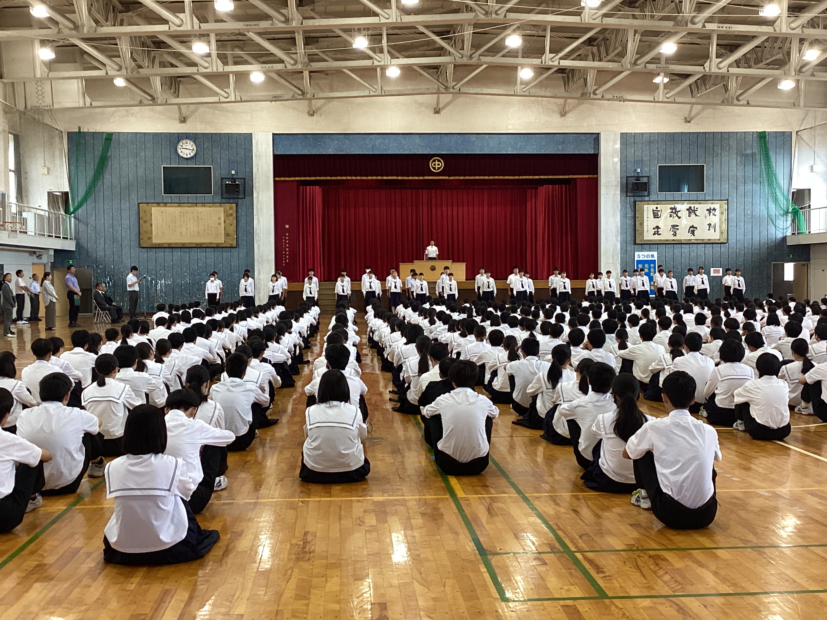 今日の1限目は、体育館で始業式・任命式・引継ぎ式が行われました。