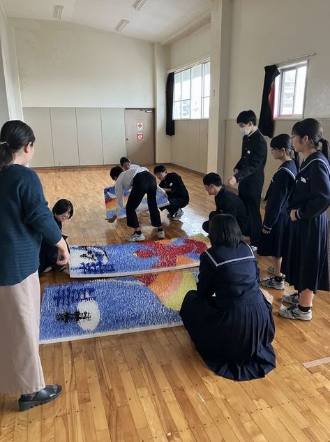 文化祭のときに作製した綿棒アートは、ようやく体育館に飾ることになりました!