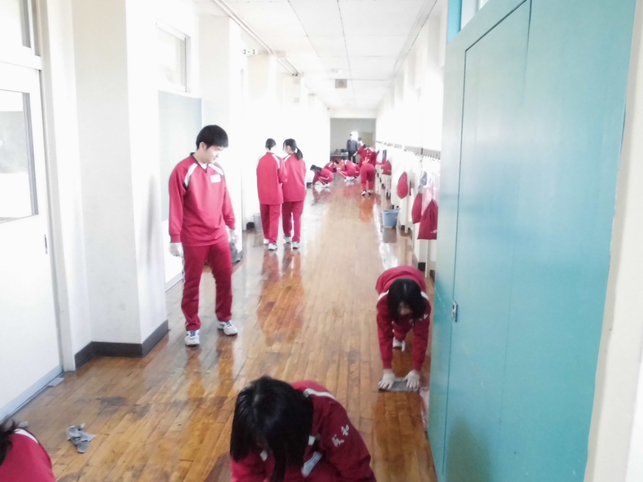 県立高校一般入試の2日目、登校した3年生が北校舎の教室や廊下にワックスをかけてくれました。