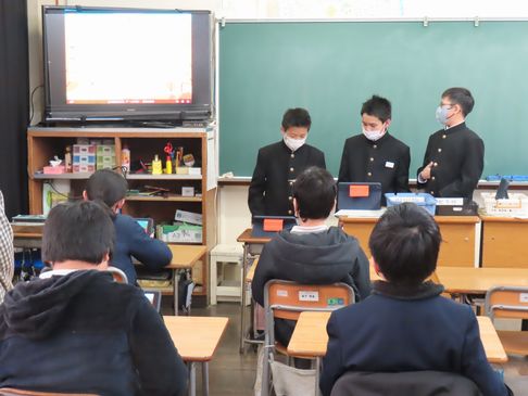 今日は午後から「新入生入学説明会」が行われました。1年生は、4月に入学してくる新入生に会えるのでとても楽しみにしていました。まずは元気いっぱいの校歌から始まり、その次に学校紹介を行いました。1年生のみなさんは、中学校の様子を知ってもらい、安心してもらおうと、自分たちで発表内容を考え、身振り手振りを交え、堂々と伝えていました。