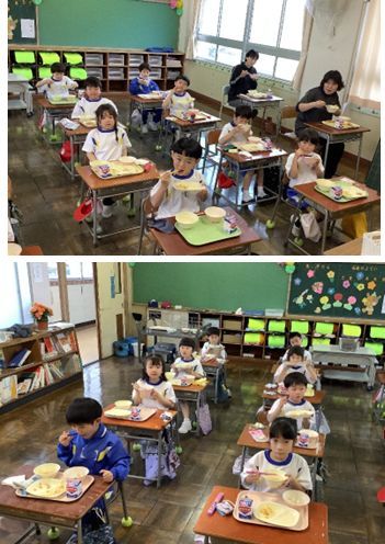 4月15日(水)から1年生の給食が始まりました。自分たちで配膳し、おいしそうに食べているところを写真にとりました。