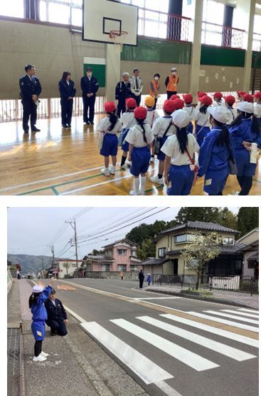4月17日(金)1年~4年の交通安全教室がありました。警察の方3名、交通指導員さん2名、民生委員さん2名が来てくださいました。ありがとうございました。
