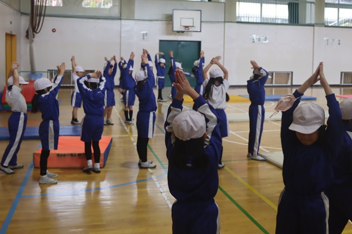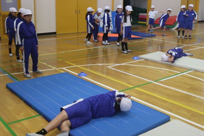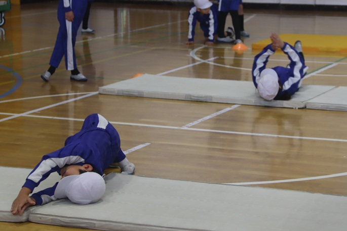 | [画像:IMG_66889.jpg][画像:IMG_6890.jpg][画像:IMG_6891.jpg] 器械運動「マット運動」が始まっています。「肩倒立→足を振り下ろして→立ち上がる」の練習をして、前転の動きにつなげていくよう |