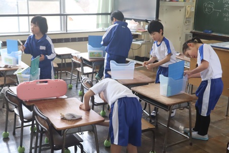 | [画像:IMG_7523.jpg][画像:IMG_7520.jpg][画像:IMG_7518.jpg] 学習のまとめとして、それぞれが対象の生き物を決めて「生き物の1年」を調査し、その結果を発表していました。発表内容や発表の仕方 |