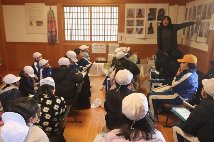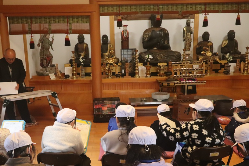 県や市の文化財に指定されている地域の宝のひとつ「ごっつあま様」です。説明を聞きながら熱心にメモをとっていました。