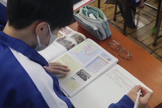 日本が日中戦争・太平洋戦争に進んでいくところを熱心に学習していました。この歴史学習を通して「戦争と平和」をしっかり学んでほしいものです。