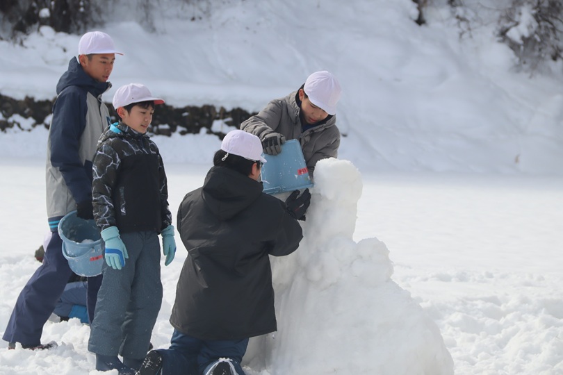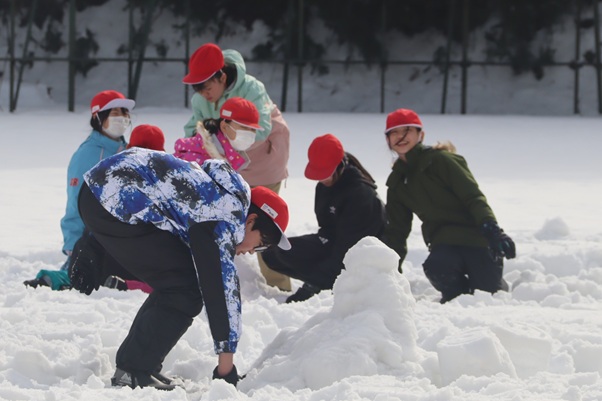青空が見える中、グラウンドに出て雪の造形を楽しんでいました。写真屋さんが来校し、卒業アルバム用の写真を撮っていました。