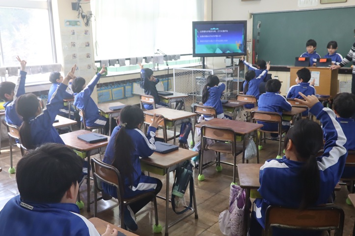 社会で学習したことをタブレット端末を活用してスライド形式でまとめました。今日はその発表をしていました。