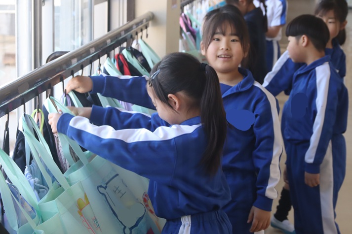 図工などの絵画を持ち帰るためのバッグに絵を描きました。上手に完成したようで、うれしそうに廊下のフックにぶら下げていました。