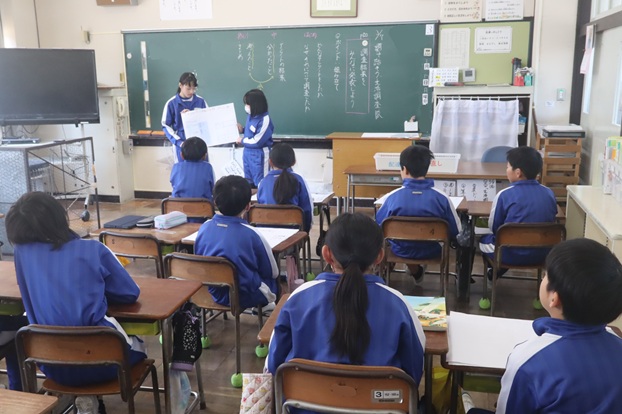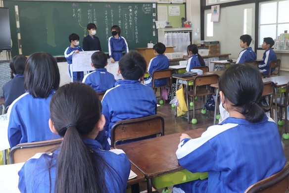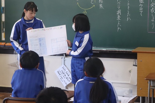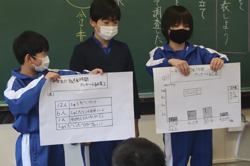 各グループでテーマを決め、アンケート調査などを行い、その結果を発表していました。分かったことを表やグラフに整理し、分かりやすく説明していました。