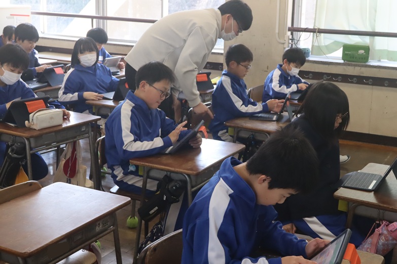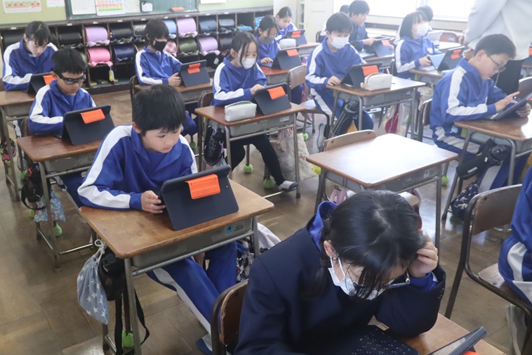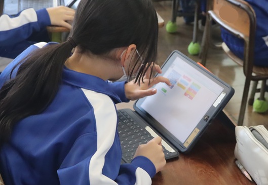 熱心に取り組んでいたので教室を覗くと「わくわくプログラミング」の学習を進めていました。プログラム(指令)の組み立てに悪戦苦闘しながらがんばっていました。