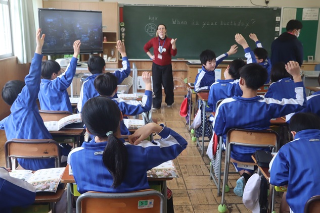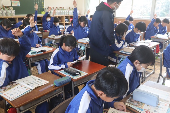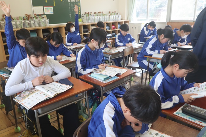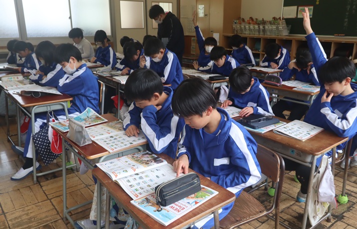 ALTが出す問題を聴き取り、一生懸命に答えを探しています。どんどん英語に慣れ親しんでいきましょう。