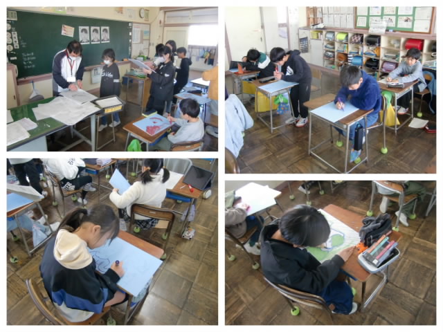 今日は国語の授業で、みんなで「都道府県すごろく」を作りました。各班の中で担当する都道府県を決め イラストをもとに文章を作りました。「○○に到着!2マス進む」「名物を食べ