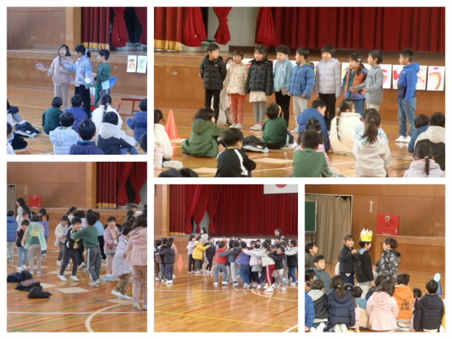 | 2月20日、全校で「6年生を送る会」を行いました。もうすぐ卒業を迎える6年生に向けて、各学年が 感謝の気持ちを込めて交流のゲームや出し物を披露しました。1年生の「じゃんけん列 |