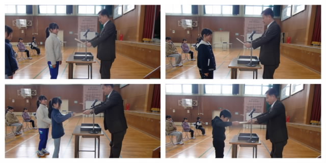 | 本日、修了式と離任式が行われました。修了式に先立ち、代表児童が二学期の歩みを振り返り、仲間と支えて きた日々や成長への思いを力強く発表しました。続いて、五年生の代表児 |