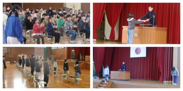来週の卒業式を前に、全校で卒業式の予行が行われました。予行の前には、書きぞめと絵画の表彰があり