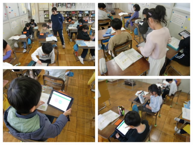 授業では、子どもたちはタブレットで教科書のQRコードを読み取り、タブレット上のワークシートアプリを