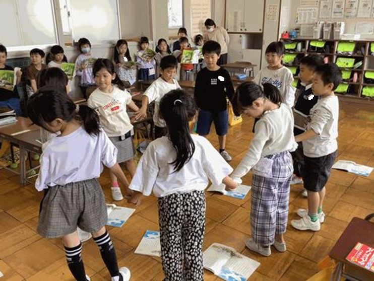 校庭に出て、みんなで音読しながら大きくジャンプしたり、くじらぐもにのったつもりで楽しく遊んだりしました。