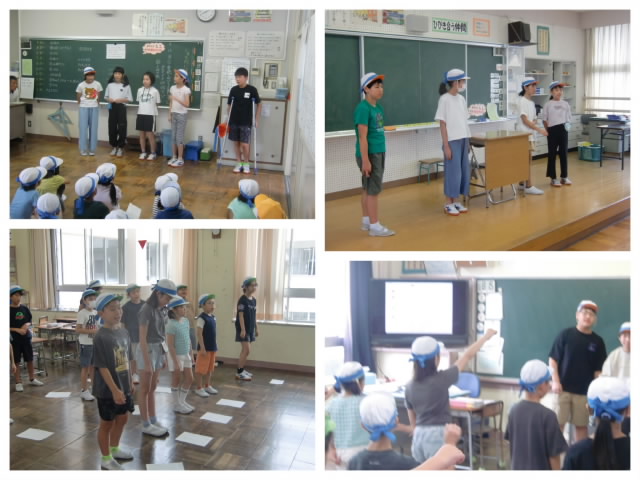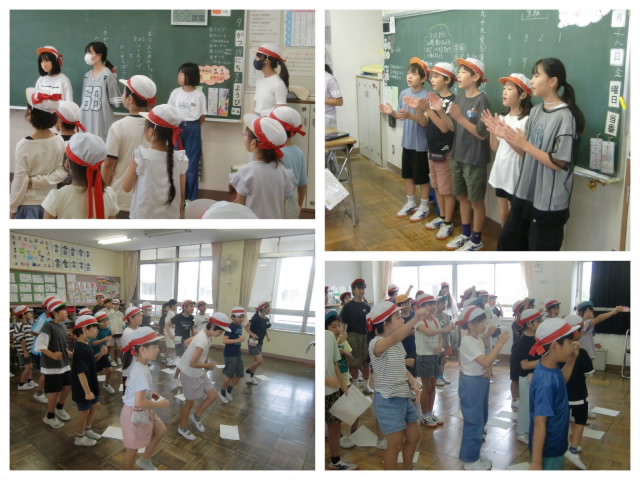 | 朝の活動時間に1年生と6年生による異学年交流が行われました。校内体育大会に向けて、一生懸命 応援や応援歌を教えてくれる6年生にたいして、1年生から感謝の気持ちを込めて |