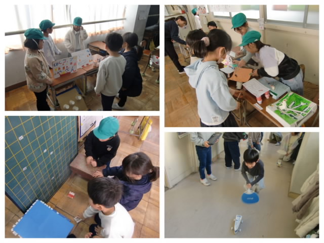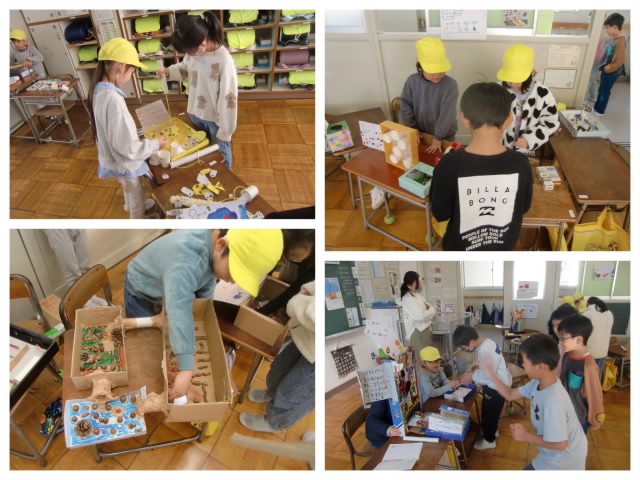 今日は、生活科の学習で「おもちゃランド」を開催しました。子どもたちが工夫して作ったおもちゃを並べ