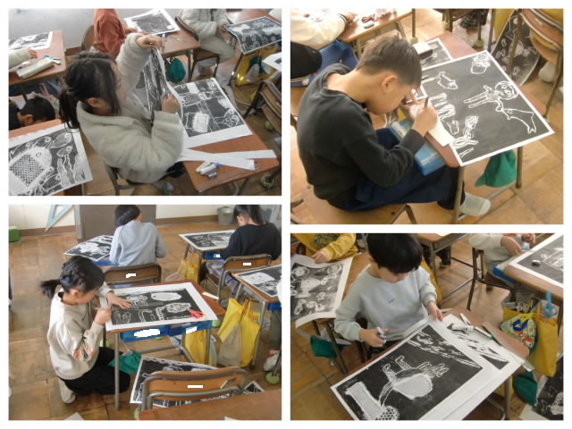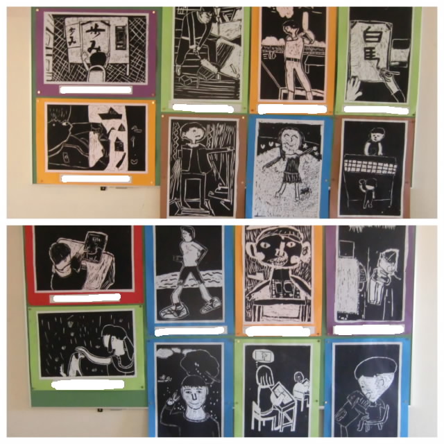 各学年で取り組んできた図工の版画作品が完成しました。子どもたちが時間をかけて丁寧に彫り上げた